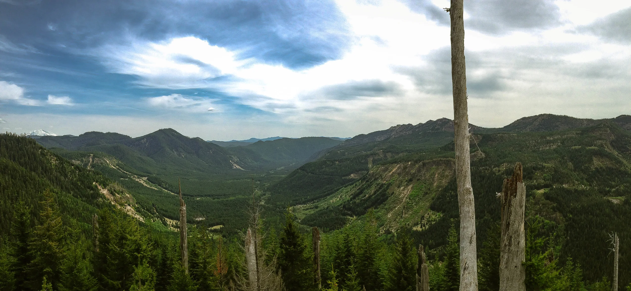 NF-99 heads west and begins climbing into high alpine valleys and along increasingly arid, rocky ridgelines. At mile 32, NF-99 emerges from the treeline altogether into the desolate alien landscape of the St. Helens blast zone. It's hard to comprehend the magnitude of the devastation. Entire mountainsides scorched to bedrock, the bleached bones of entire forests are laid out like matchsticks with a grotesque symmetry. NF-99 snakes like an asphalt ribbon, rising and dipping along the contours of hillsides, doubling back on itself, visible for several miles as it stretches westward along the ridge.